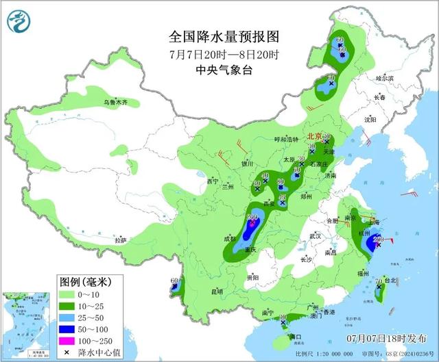 7月7日20时至8日20时,浙江中东部、四川东部、陕西中部和西南部、重庆西南部、云南西北部、台湾岛西部、内蒙古东北部、山西中南部、河北中部等地部分地区有大到暴雨,其中,浙江东南部、四川东北部等地局地有大暴雨(100~200毫米)。